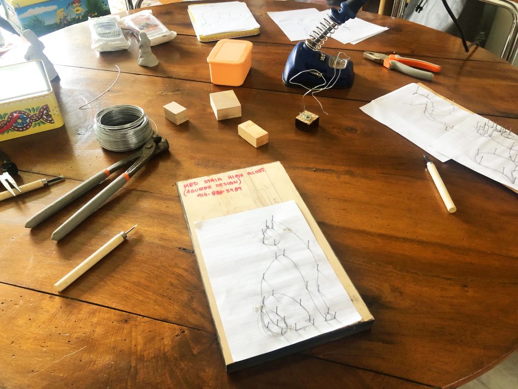 la sculpture – A partir de fer souple, soit du fil de fer épais, vous réaliserez une sculpture en vous basant sur le tracé d’un dessin préalable. Une fois les points nodaux soudés, il vous faudra la positionner sur un socle en bois.